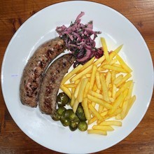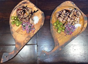 Повара приготовят для вас сочный шашлык из свинины или курицы, купаты, аппетитный стейк, жаркое из дичи, манты, домашние пельмени. Для тех, кто не сильно голоден персонал предложит салаты, к примеру "Греческий" или "Цезарь", а для любителей супов есть "Солянка" и "Шурпа".
